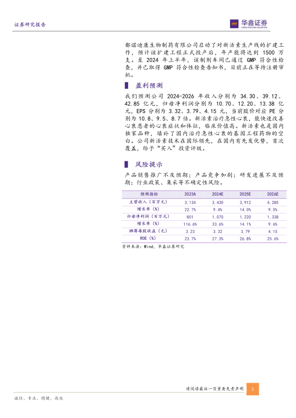 我们预测公司2024-2026年收入分别为34.30、39.12、42.85亿元,归母净利润分别为10.70、12.20、13.38亿元,EPS分别为3.32、3.79、4.15元,当前股价对应PE分别为10.8、9.5、8.7倍。新活素治疗急性心衰,能快速改善心衰患者的心衰症状和体征,临床价值高。新活素也是国内独家品种,填补了国内治疗急性心衰的基因工程药物的空白。公司新活素技术在国际领先,在国内有先发优势,首次覆盖,给予“买入”投资评级。