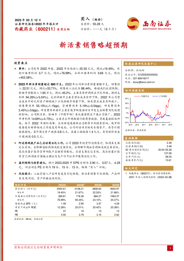 本报告对西藏药业(600211)2022年年报进行了深度分析,核心观点如下: