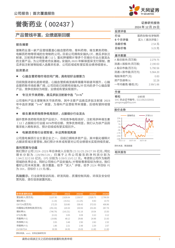 尽管誉衡药业在2018年至2023年间营收整体呈现下滑态势,但其利润端已实现显著修复,并在2024年前三季度保持稳定盈利。关键产品的市场表现,如安脑丸/片解除医保支付限制后营收大幅增长,鹿瓜多肽注射液成功入选“3+N”联盟集采,以及注射用多种维生素(12)长期占据细分市场80%以上份额,均预示着公司未来业绩有望持续回升。公司通过“产品为王”的战略,持续推进产品引进、合作开发和自主研发,布局差异化产品,进一步巩固了竞争优势。基于对公司产品线、市场前景和盈利能力的综合分析,报告首次覆盖并给予“买入”评级,设定2024年目标PE为38X,目标价3.23元/股,充分体现了对誉衡药业未来发展潜力的积极预期。