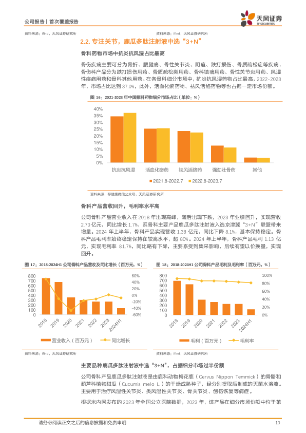 公司骨科产品主要聚焦关节类药物,其中主要产品鹿瓜多肽注射液2023年中选京津冀“3+N”联盟,为骨科产品营收带来增量,后续有望持续增长。