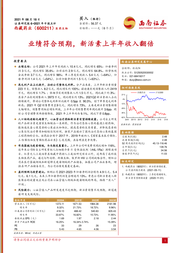 本报告通过对西藏药业2021年中报的详细解读,认为公司业绩符合预期,新活素销售强劲,盈利能力持续提升。同时,公司积极布局多元化业务,为长期发展注入动力。维持“买入”评级,但需关注心血管植入产品研发进度、新活素销售情况以及新冠疫苗研发风险。