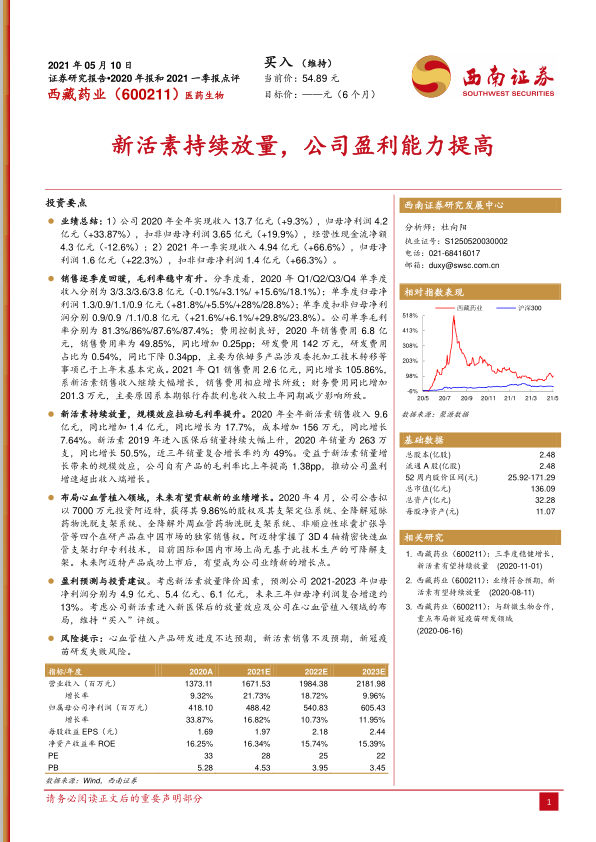 本报告通过对西藏药业2020年年报和2021年一季报的详细分析,突出了新活素对公司业绩增长的关键作用,以及公司在心血管植入领域的战略布局。公司盈利能力稳步提升,未来增长潜力可期。维持“买入”评级,但同时也提示了相关风险,为投资者提供了全面的参考信息。