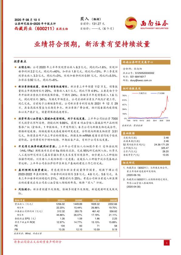 西藏药业2020年中报显示公司业绩稳健增长,核心产品新活素和依姆多表现良好,为公司业绩增长提供动力。公司积极布局心血管植入器械和疫苗领域,有利于长远发展。维持“买入”评级,但需关注新活素、依姆多销量不及预期以及新冠疫苗研发失败等风险。