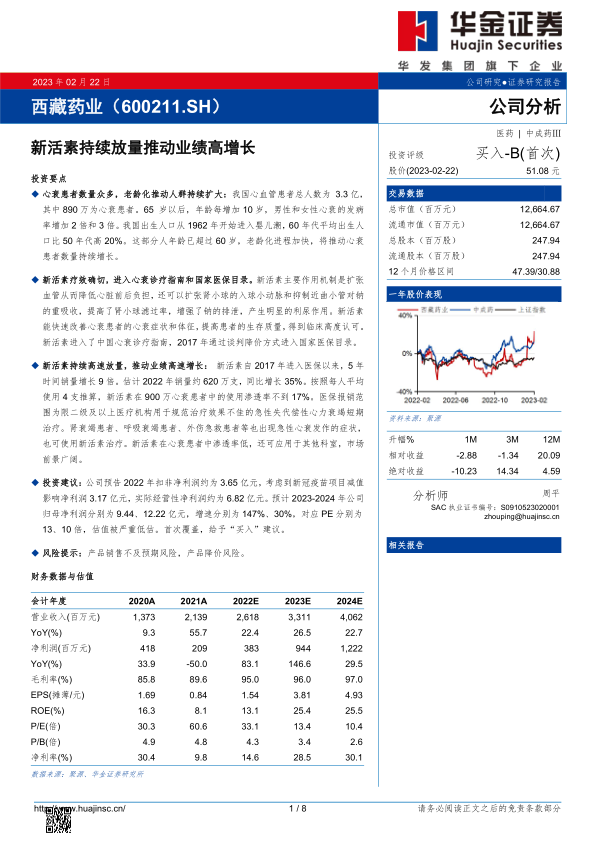 根据上述盈利预测,公司2023年和2024年对应的市盈率(PE)分别为13倍和10倍。考虑到新活素作为独家产品所具备的良好竞争格局、巨大的心衰市场空间以及其持续放量对公司业绩的强劲推动作用,当前估值被认为严重低估。因此,华金证券首次覆盖西藏药业,并给予“买入”的投资建议。