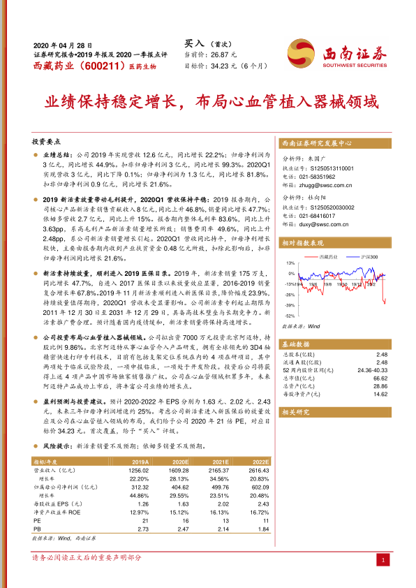 本报告对西藏药业2019年年报及2020年一季报进行了深入分析,指出公司业绩保持稳定增长,主要得益于核心产品新活素在医保目录下的持续放量。新活素作为急性心衰一线治疗药物,其高技术壁垒和市场垄断地位为公司提供了坚实的业绩支撑。同时,公司积极进行战略转型,通过投资北京阿迈特,成功布局心血管植入器械这一高增长潜力领域,有望在未来形成新的业绩增长极,优化产品结构并降低单一产品风险。基于对核心产品增长潜力和新业务布局的积极预期,报告给予公司“买入”评级,并设定了具有吸引力的目标价。然而,投资者仍需关注新活素和依姆多销量不及预期的潜在风险。