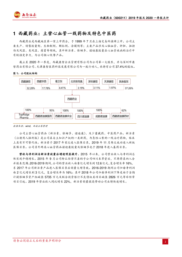 西藏药业作为西藏地区首家上市药企,主营业务涵盖胶囊剂、生物制剂、颗粒剂、涂膜剂等多种剂型,产品主要集中在心脑血管、肝胆、扭挫伤及风湿、类风湿、感冒等领域。其中,新活素、依姆多、诺迪康胶囊在心血管疾病治疗中具有较强竞争力,是公司的核心优势产品。截至2020年一季度,西藏康哲企业管理有限公司及其一致行动人合计持有公司37.4%的股权,为公司第一大股东,为公司的稳定发展提供了支持。新活素作为公司自主知识产权的一类新药,是急性心衰的一线治疗药物,具有临床不可替代性,在国内市场形成了相对垄断的地位。