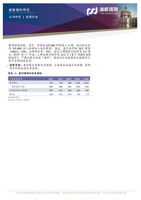 上调港股目标价至9.2港元,维持“买入”评级;上调A股目标价至14.5元,但下调A股评级至“持有”:根据更新的财务状况,我们将2024E/2025E/2026E归母净亏损预测分别调整-13%/-13%/+7%,主要由于这三年略微上调收入预测及毛利率预测,2024E/2025E下调研发费用预测但上调销售费用预测、2026E上调研发费用和销售费用预测导致。另外,考虑到ICP-488即将进入3期,我们此次亦将ICP-488收入预测纳入我们模型。因此,基于我们的DCF模型(WACC:10%,永续增长率:3%),我们上调港股目标价至9.2港元,维持“买入”评级;上调A股目标价至14.5元(基于75%的A/H股溢价),下调A股评级至“持有”,因我们认为短期内A股股价已处于合理估值区间。
