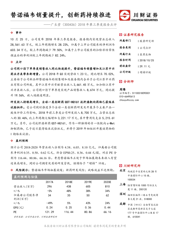 2018年第三季度报告点评:替诺福韦销量提升,创新药持续推进
