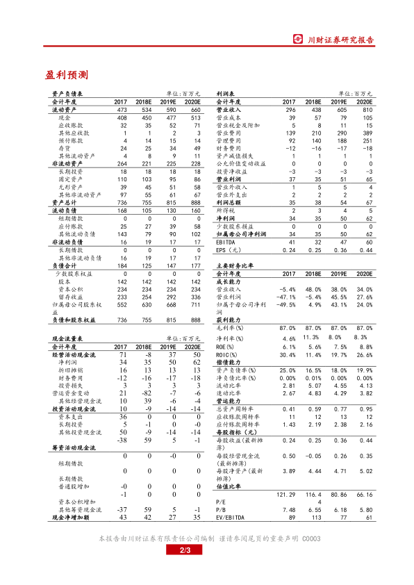 公司资产规模预计稳步增长,其中现金储备充足并持续增加,显示出较好的流动性。应收账款和存货也随业务扩张而增长。负债总额在2018年预计有所下降后,在2019-2020年随业务增长而回升,但整体负债水平保持在较低位。股东权益持续增长,反映公司净资产的积累。