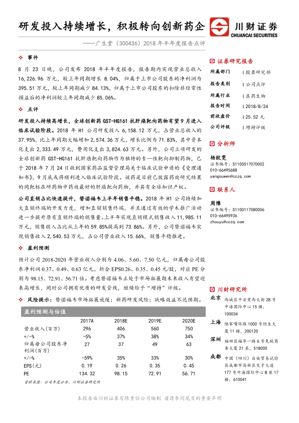 本报告分析了广生堂2018年半年度报告,指出公司在研发投入、直销模式拓展等方面取得积极进展。研发投入的大幅增长和创新药的临床试验进展预示着公司未来的增长潜力。同时,直销模式占比的提升也反映了公司在销售策略上的有效调整。基于这些因素,维持对广生堂的“增持”评级。但同时也提示了替诺福韦市场拓展放缓、新药研发风险以及战略效益不达预期等风险。