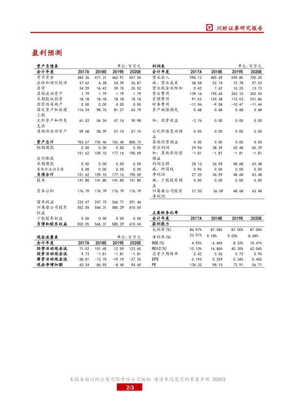预计公司2018-2020年营业收入分别为4.06亿元、5.60亿元、7.50亿元,归属母公司股东净利润分别为0.37亿元、0.49亿元、0.63亿元,对应EPS分别为0.26元/股、0.35元/股、0.45元/股,对应PE分别为98.15倍、72.91倍、56.71倍。