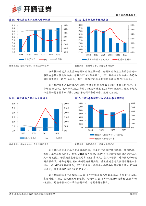 公司建立呼吸系统、心血管、抗感染、神经系统、抗肿瘤和女性健康等六大领域的产品链,技术高壁垒、竞争格局良好以及成长性强的多元化产品梯队,为公司的持续发展奠定基础。重点品种持续放量,公司掌握地屈孕酮原料药的合成技术,实现规模化生产和销售,地屈孕酮制剂处于快速放量阶段。司美格鲁肽原料药已完成中试、杂质研究和成品方法学验证,具有较好的技术和专利储备,预期市场前景良好。