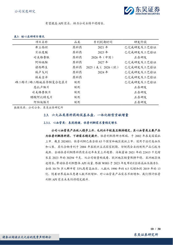特色原料药+制剂一体化发展,有望贡献业绩增量:中短期内大量专利药到期,有望带动API需求增长。2013-2030年间,全球药品中共有1666个化合物专利到期,根据EvaluatePharma统计,2020-2024年间,具有到期风险的专利药呈急剧增加趋势,合计市场规模达1590亿美元。公司特色原料药品种储备丰富,女性健康类等品种仍处在快速放量阶段,有望带动原料药主业稳健增长。同时公司积极推进一体化转型,首个一体化品种地屈孕酮片于2023年获批上市,2024H1实现销售9248万元,放量迅速。公司“308吨特色原料药及2亿片抗肿瘤制剂项目(一期)”建成后将具备醋酸阿比特龙片3000万片/年和恩扎卢胺片5000万片/年产能,对应产值2.79亿元。在集采背景下,一体化品种具备显著优势。