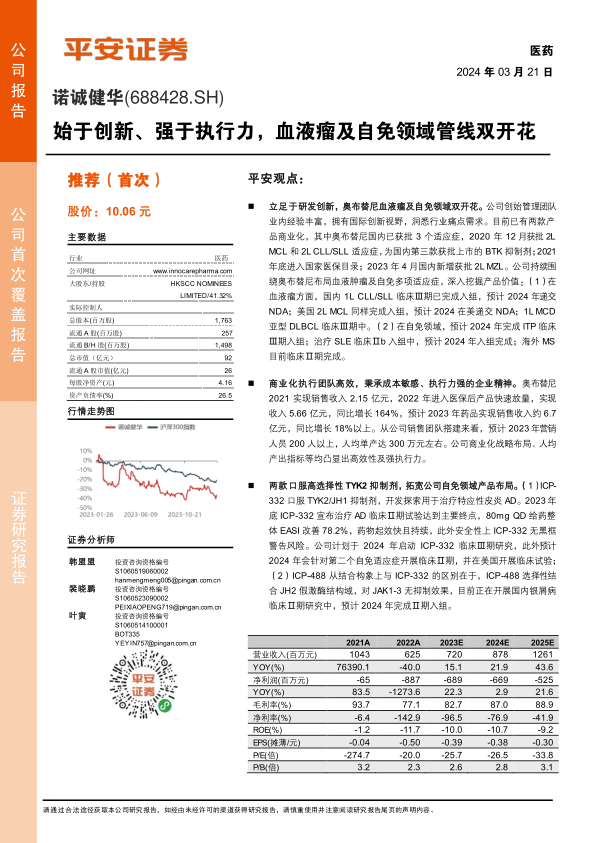 投资建议:2024年公司将有多款产品国内申报NDA,其中奥布替尼1L CLL/SLL、Tafasitamab2L DLBCL、ICP-723(第二代TRK)预计2024年国内递交NDA,此外2024年多个管线进入关键性Ⅲ期,其中奥布替尼治疗ITP预计2024年完成国内Ⅲ期入组,ICP-332治疗AD国内启动Ⅲ期。预计2023-2025年公司收入主要还是来自奥布替尼的放量,整体年度实现营收分别为7.2/8.78/12.61亿元。针对公司中后期管线DCF估值,对应公司市值205.8亿元。公司创新力强、执行力强、商业团队高效高质,未来陆续多个产品逐步进入销售或研发收获期,首次覆盖给予“推荐”评级。