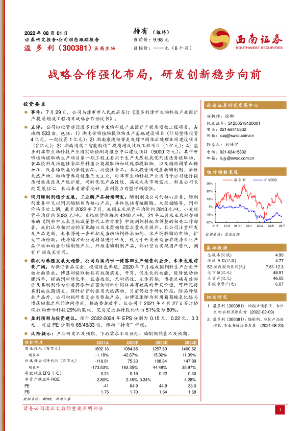 本报告分析了溢多利与津市市人民政府签订战略合作协议的背景和意义,指出公司通过扩大生物科技产业园的产能和效益,进一步强化了在生物酶制剂、活性天然产物、动物营养与健康三大主业的布局。同时,报告强调了公司在饲用酶制剂和替抗产品领域的优势和发展潜力,并结合行业趋势和市场需求,对公司的未来发展前景进行了展望。最后,报告给出了盈利预测和投资建议,为投资者提供了参考。