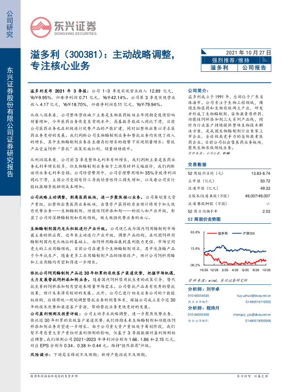 公司盈利预测及投资评级:公司主动寻求战略调整,进一步聚焦优势业务,依托近 30 年积累的农牧客户渠道优势,我们预期未来生物酶制剂和功能性饲料添加剂业务有望进一步增长。由于公司重大资产重组处于筹划阶段,我们暂不考虑重大资产重组对盈利预测的影响,仅基于 3 季报数据对盈利预测相应调整。 我们预测公司 2021~2023 年净利润分别为 1.66、 1.86 和 2.15 亿元,对应 EPS 分别为 0.34、0.38 和 0.44 元。维持“强烈推荐”评级。