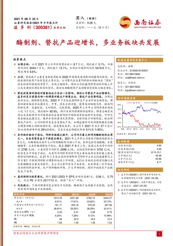 溢多利在2021年上半年面临生物医药板块恢复常态带来的营收压力,但通过精准把握市场机遇,在替抗产品和饲用酶制剂两大核心业务板块实现了显著增长。受益于国家“禁抗”政策的深入推进,公司独有的博落回散产品市场需求旺盛,饲料添加剂收入同比大幅增长。同时,农作物价格高位以及饲料减量替代政策的实施,也为公司的饲用酶制剂业务带来了新的增长空间。公司通过持续研发和战略收购,不断巩固其在生物酶制剂和替抗产品领域的领先地位。尽管存在市场需求不及预期等风险,但基于其核心业务的强劲增长潜力和市场优势,分析师维持“买入”评级,并对未来盈利能力持乐观态度。