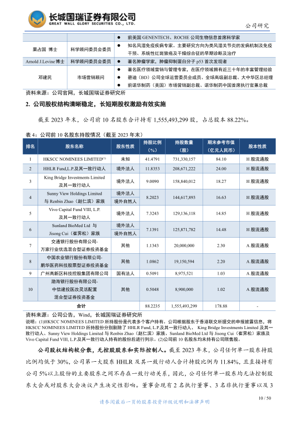 截至2023年末,公司前十大股东合计持有15.55亿股,占总股本的88.22%,股权结构分散,无控股股东和实际控制人。公司有效执行了多项员工股权激励计划,包括2015年、2016年、2018年首次公开发售前激励计划(股票期权、限制性股份单位)以及2023年股权激励计划和科创板限制性股票激励计划,通过设立专业信托管理,确保了激励的有效实施。截至2023年末,公司拥有4家境外子公司、6家境内子公司及1家合营企业,业务涵盖投资控股、临床开发、医疗及医药研究、生产以及营销推广服务,形成了多元化的业务布局。