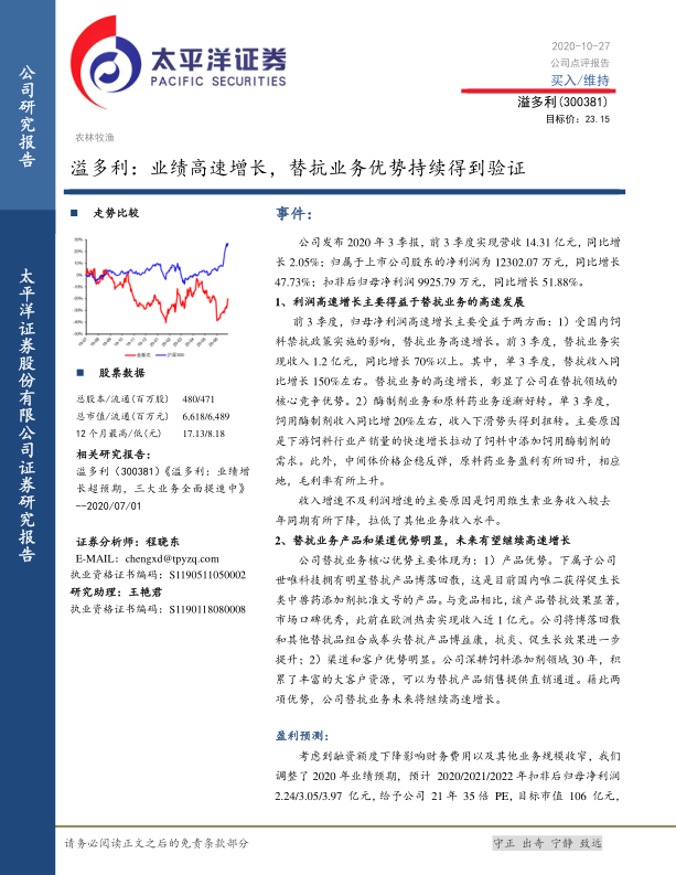 溢多利公司在2020年前三季度实现了业绩的高速增长,这主要得益于替抗业务的快速发展以及酶制剂和原料药业务的复苏。公司在替抗领域拥有产品和渠道优势,未来有望继续保持增长势头。太平洋证券维持对公司的“买入”评级,但同时也提示了政策执行、研发进度和环保等方面的风险。