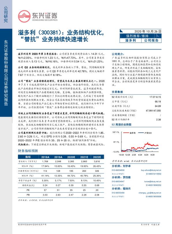 本报告对溢多利公司进行了深入研究,指出公司通过优化业务结构,提升高毛利率业务占比,实现了盈利能力的显著提升。尤其是在饲料禁抗政策的推动下,公司提前布局的“替抗”业务有望迎来高速增长,成为未来主要的盈利增长点。同时,传统主业饲用酶制剂业务受益于下游需求复苏,非饲用酶制剂业务也存在进口替代机遇。维持“强烈推荐”评级,但需关注下游需求、产能投放以及商誉减值等风险。