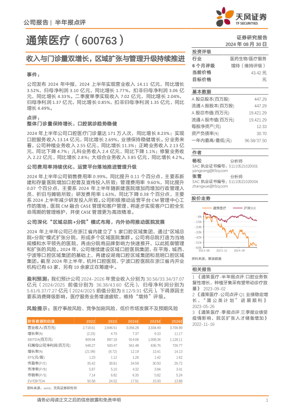 本报告对通策医疗2024年中报的分析表明,公司在口腔医疗服务领域保持稳健增长,并通过区域扩张和管理升级不断提升竞争力。虽然受消费降级影响,报告下调了公司未来营收和利润预期,但公司整体发展态势良好,维持“增持”评级。投资者应关注公司在区域扩张、运营平台建设以及市场竞争等方面的风险。