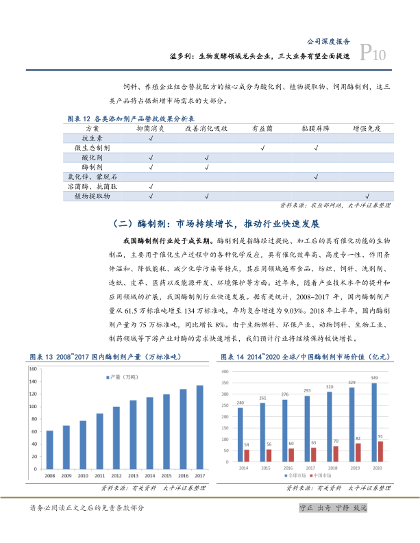 公司以饲用酶制剂起家,目前该产品占酶制剂营收的70%,在国内市场占有率接近20%,具有明显的先发优势。通过2014年并购鸿鹰生物,公司酶制剂业务已扩展至食品酶、纺织酶等领域。随着食品用酶产能的投放和产品系列的日益完善,公司酶制剂业务在国内外的市场份额有望持续提升。