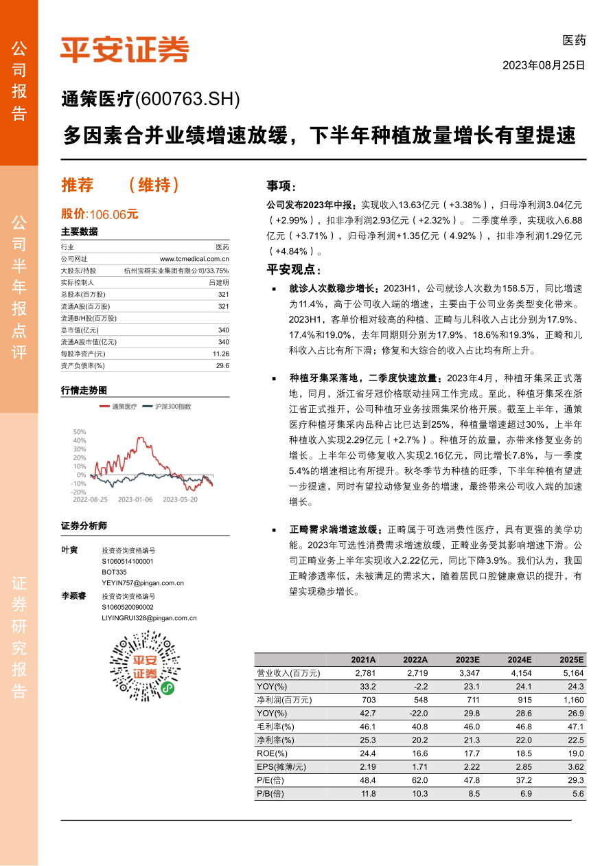 本报告分析了通策医疗2023年中报,指出业绩增速放缓的原因,包括业务类型变化、正畸需求放缓以及新开医院成本增加。报告强调种植牙集采落地后的放量增长潜力,以及蒲公英计划对公司长期发展的积极作用。尽管调整了盈利预测,但维持“推荐”评级,认为公司未来发展向好。同时,报告也提示了行业增长、收购进度和流行病等风险。
