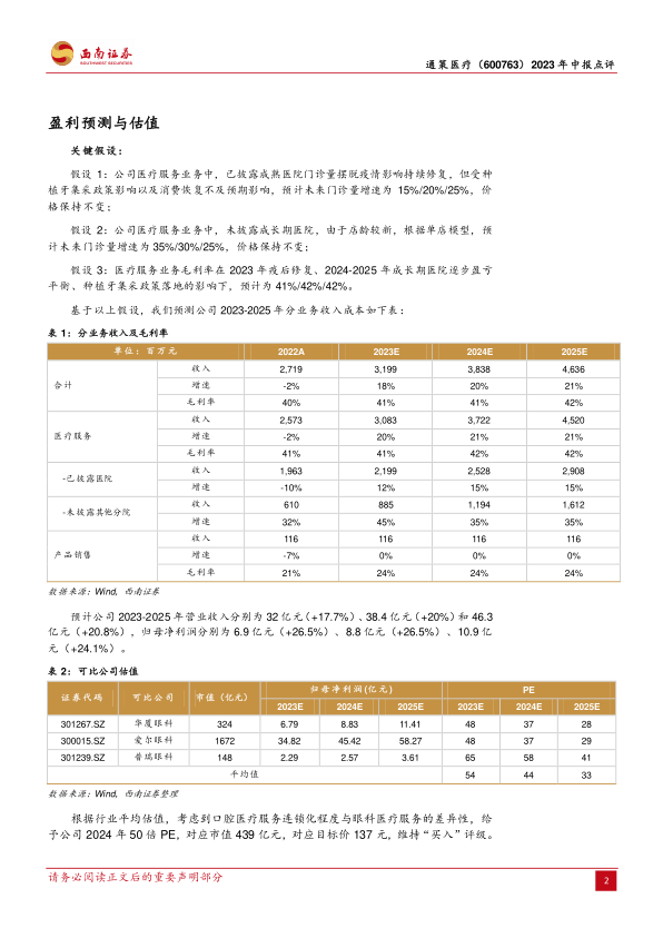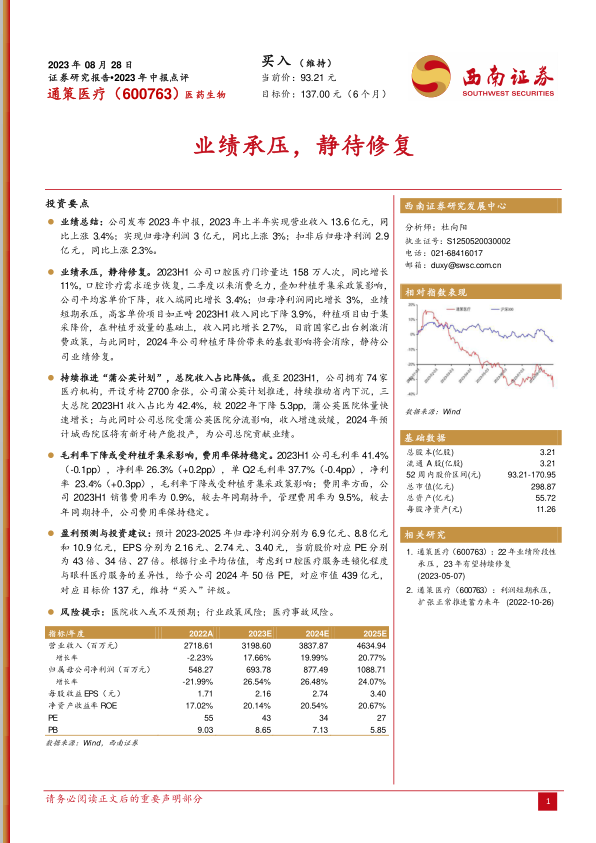通策医疗在2023年上半年业绩增长面临挑战,主要受消费环境和种植牙集采政策影响,导致客单价下降和高客单价项目增速放缓。然而,公司通过积极推进“蒲公英计划”实现市场下沉和扩张,培育了新的增长点,并计划在2024年增加总院产能,为未来发展积蓄动能。分析师预计,随着集采政策影响的逐步消化和消费环境的改善,公司业绩有望在2024年迎来修复和加速增长。基于对公司未来盈利能力的积极展望,分析师维持“买入”评级,并给出了137元的目标价,体现了对公司长期发展潜力的认可。
