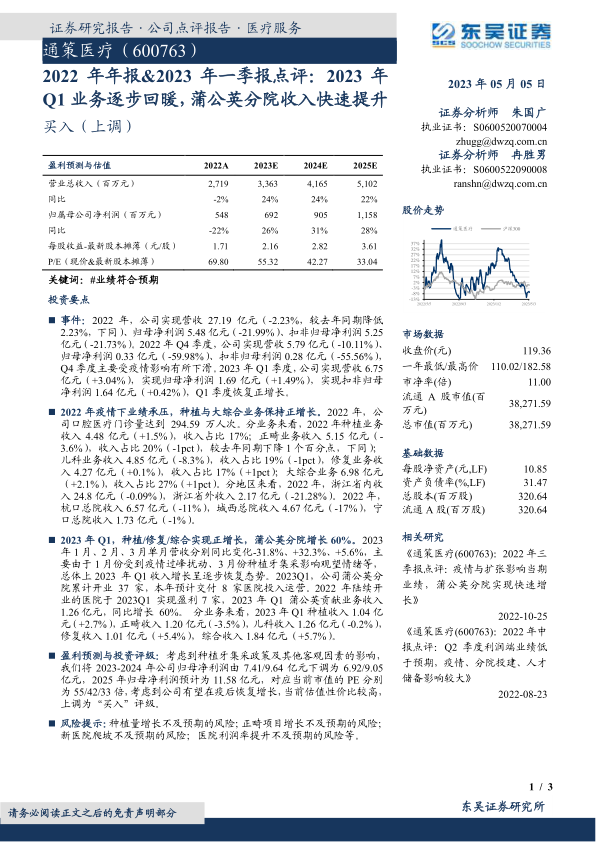 鉴于公司在疫后有望恢复增长,且当前估值具备较高性价比,分析师将通策医疗的投资评级上调为“买入”。同时,报告提示了多项风险,包括种植量增长不及预期、正畸项目增长不及预期、新医院爬坡不及预期以及医院利润率提升不及预期等。