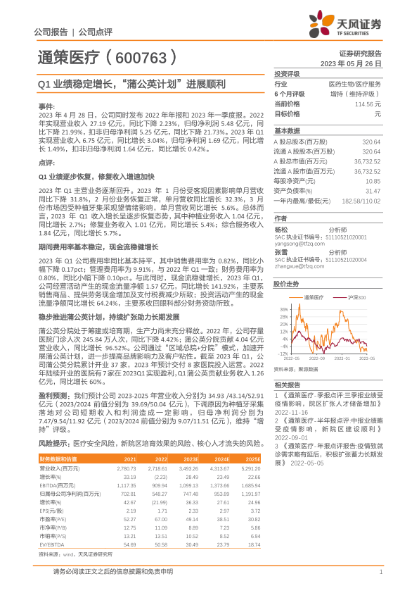 本报告分析了通策医疗2023年一季度业绩,指出公司业绩逐步恢复,现金流稳健增长。“蒲公英计划”稳步推进,有望成为公司未来增长的重要动力。尽管种植牙集采对公司短期业绩造成一定影响,但维持公司“增持”评级。同时,报告也提示了医疗安全、新院区培育以及人才流失等风险。