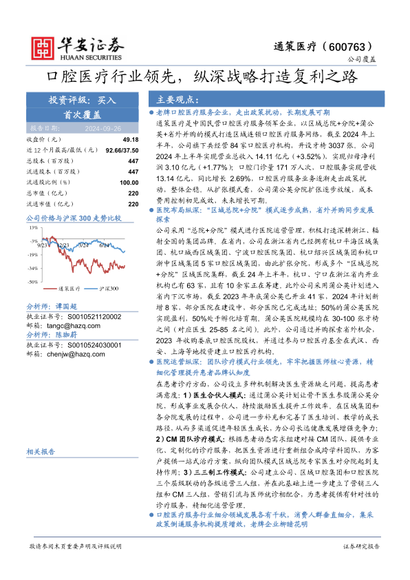 公司是浙江省内口腔医疗服务老牌企业,区域总院+分院的经营模式助力公司扎根浙江、辐射省外。短期维度看,种植牙集采落地一年有余,公司业务企稳回升,短期业绩有望稳定提升;中长期维度看,口腔医疗服务行业人工成本占比高&固定且对医生依赖度高,公司通过人才培养、经营管理模式创新等多维度的探索,初步实现了对人才、科研和获客的管理,长期良性发展确定性高。我们预计2024~2026年公司将实现营业收入29.49/33.22/36.76亿元(+3.6%/12.7%/10.7%)将实现归母净利润5.68/6.65/7.62亿元(+13.4%/17.2%/14.6%),首次覆盖,给予“买入”评级。