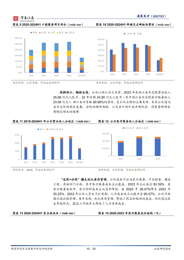 业绩表现与财务分析: 尽管受到政策扰动,通策医疗的业绩已逐步企稳回升。2023年,公司实现营业收入28.47亿元,同比增长4.70%;归母净利润5亿元,同比下降8.72%。进入2024年上半年,公司业绩显著改善,实现营业总收入14.11亿元,同比增长3.52%;归母净利润3.10亿元,同比增长1.77%。口腔医疗服务是公司最主要的收入来源,2024年上半年实现营收13.14亿元,同比增长2.69%。在细分业务方面,公司实现了均衡发展,2023年大综合板块占比28.11%,种植17.81%,正畸18.56%,儿科18.58%,修复16.64%。值得注意的是,受种植牙集采政策影响,2022年种植板块营收增速放缓,但2023年已企稳回升至4.79亿元,同比增长6.95%,种植量达5.3万+颗,同比增长47%,显示出公司积极应对政策变化的能力。公司深耕浙江市场,2023年浙江省内营收达25.68亿元,贡献了90.68%的营收。在成本控制方面,医疗服务成本占比最高(2023年达93.39%),其中人力成本占比高,但医疗材料成本占比逐年降低(从2020年的28.47%降至2023年的25.25%),显示出公司在供应链管理和集中采购方面的成效。公司整体毛利率和净利率在经历政策影响后,2024年上半年已企稳回升至40.83%和26.06%,盈利能力领跑行业。此外,公司费用管控能力优秀,管理费用率从2018年的12.28%下降至2024年上半年的9.60%。公司牙椅数量和门诊量持续增长,2023年牙椅数量达3000张,门诊量达335.33万人次,2024年上半年门诊量为171万人次,预示着未来量价齐升的趋势。