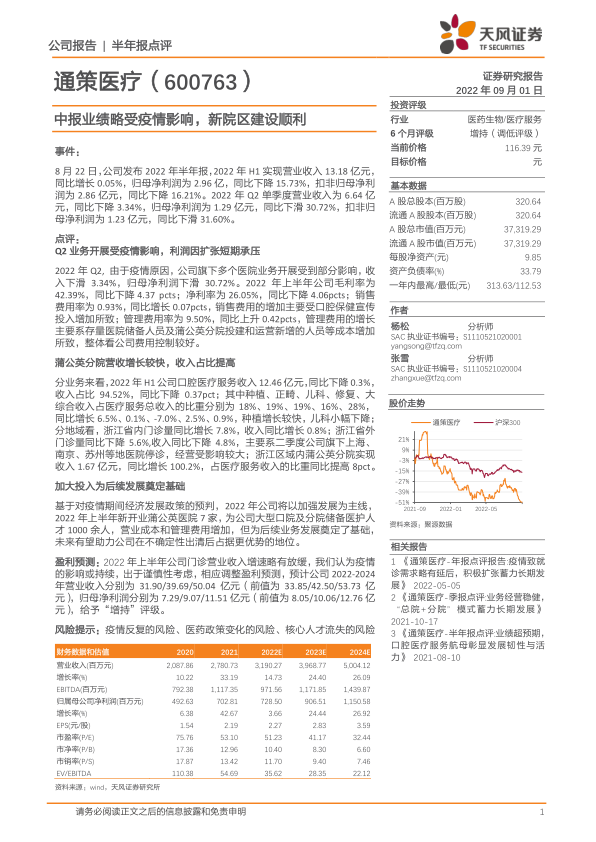 盈利预测:2022年上半年公司门诊营业收入增速略有放缓,我们认为疫情的影响或持续,出于谨慎性考虑,相应调整盈利预测,预计公司2022-2024年营业收入分别为31.90/39.69/50.04亿元(前值为33.85/42.50/53.73亿元),归母净利润分别为7.29/9.07/11.51亿元(前值为8.05/10.06/12.76亿元),给予“增持”评级。