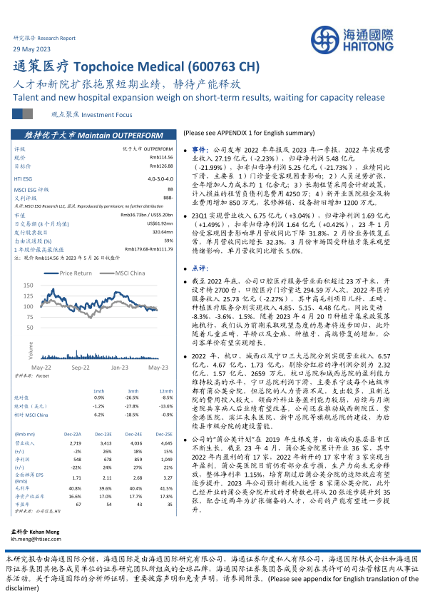 事件: 公司发布 2022 年年报及 2023 年一季报, 2022 年实现营业收入 27.19 亿元( -2.23%),归母净利润 5.48 亿元( -21.99%),扣非归母净利润 5.25 亿元( -21.73%),业绩同比下滑,主要系 1)门诊量受客观因素影响; 2)人员逆势扩张,全年增加人力成本约 1 亿余元; 3)长期租赁采用会计新政策,计入损益的租赁负债利息费用 4250 万; 4)新开业医院租金及物业费用增加 850 万元,装修摊销、设备折旧增加 1200 万元。