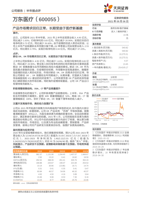 本报告分析了万东医疗2021年半年报,指出公司在疫情常态化下,虽然面临移动DR、DR市场需求回归正常的挑战,但通过积极调整销售结构,提升高端产品销量,以及受益于医疗新基建政策和美的集团的战略支持,公司长期发展前景依然值得期待。维持“买入”评级,但需关注产品研发、疫情影响和市场竞争等风险。
