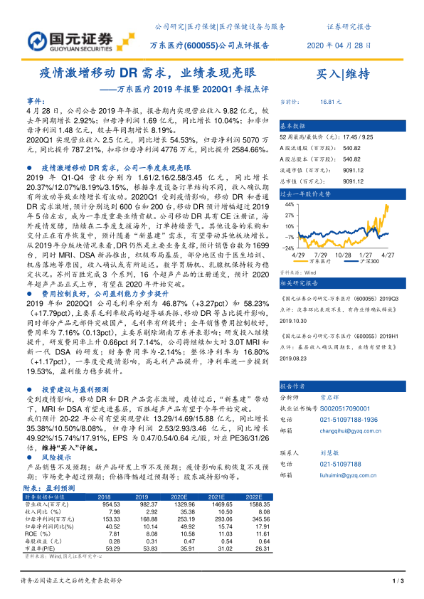 万东医疗受益于疫情期间移动DR需求的激增,2020年一季度业绩表现亮眼。公司通过优化产品结构、控制费用等方式,盈利能力稳步提升。维持“买入”评级,但需关注产品销售、研发、疫情影响、市场竞争和股东减持等风险。