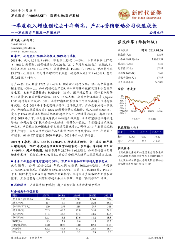 万东医疗在2018年和2019年第一季度展现出强劲的业绩增长,主要得益于其核心产品线的技术升级、国产化进程以及营销策略的有效转型。公司在DR、MRI、DSA等影像设备领域持续发力,高端产品市场拓展顺利,新产品如64排CT和百胜彩超的上市预期将进一步驱动未来增长。万里云业务的扭亏为盈和百胜彩超业务的注入预期,为公司提供了额外的增长动力。尽管存在产品销售和新产品上市进度不及预期的风险,但基于其稳健的财务表现、清晰的产品战略和市场拓展计划,公司未来三年的复合净利润增速有望超过30%,维持“强烈推荐”评级。