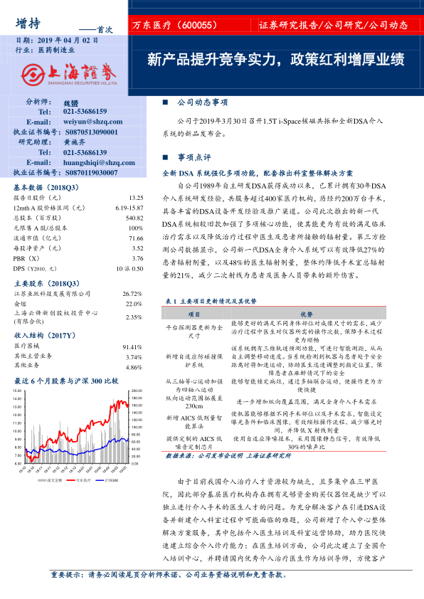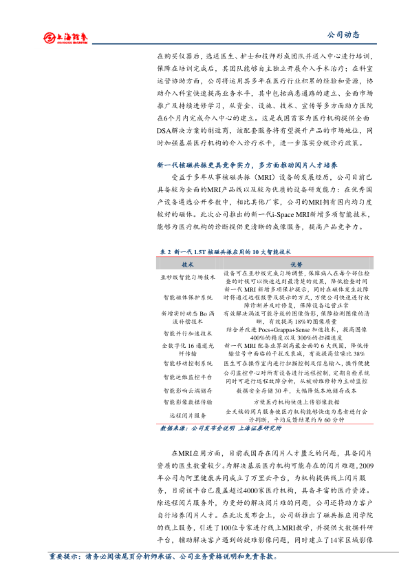 本报告分析了万东医疗的新产品发布会,认为其新一代DSA系统和i-Space核磁共振,以及配套的整体解决方案,将有效提升公司在基层医疗市场的竞争力。同时,随着分级诊疗等政策的推进,基层医疗机构对相关设备的需求将快速释放,万东医疗有望充分受益于市场规模的扩大和国产设备份额的提高。因此,报告首次覆盖,给予万东医疗“增持”评级。