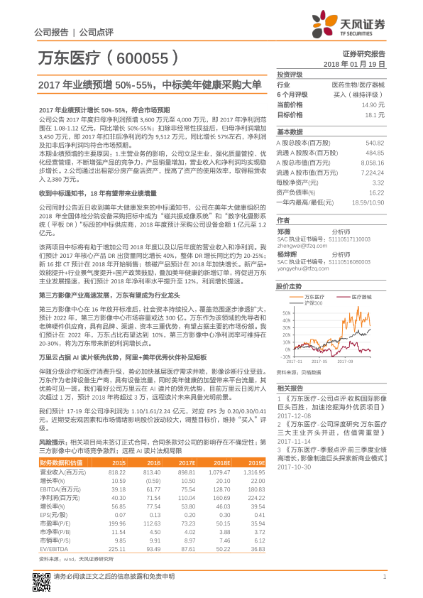 本报告认为,万东医疗2017年业绩增长符合预期,中标美年健康采购大单将带来业绩增量。公司在第三方影像中心领域具备龙头潜力,万里云在AI读片领域具有领先优势。维持“买入”评级,但需关注相关风险。