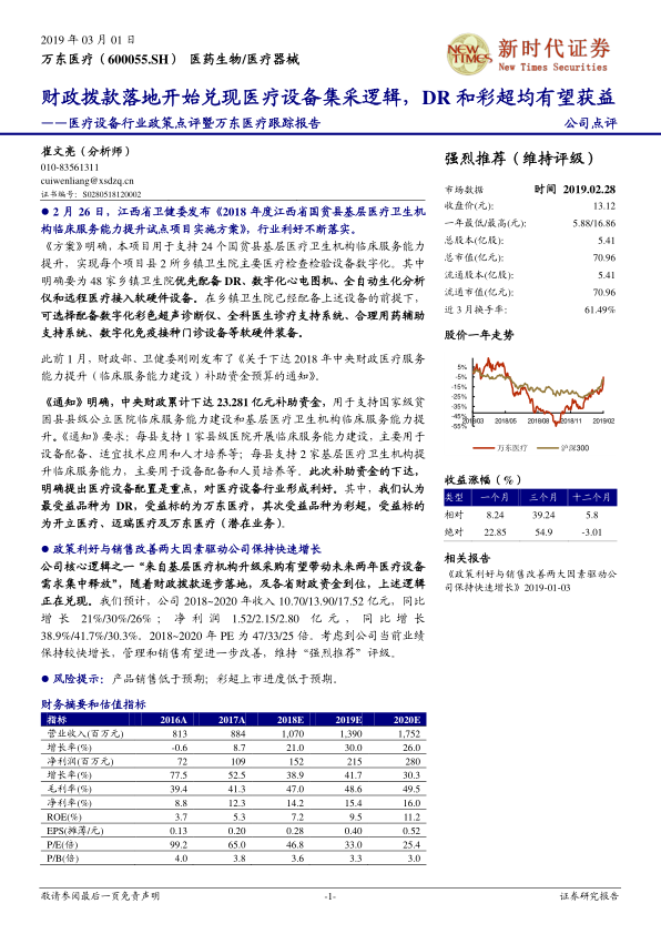 考虑到公司当前业绩保持较快增长,且管理和销售有望进一步改善,报告维持对万东医疗的“强烈推荐”评级。同时,报告也提示了潜在风险,包括产品销售低于预期和彩超上市进度低于预期。