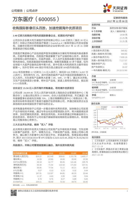 万东医疗通过2.48亿欧元收购国际影像巨头百胜医疗集团,成功拓宽了技术护城河,补足了小影像产品线,并借助百胜的全球销售网络实现了渠道协同。同时,公司合伙设立15.56亿人民币海外并购基金,旨在整合境外优质资源,加速产业升级和技术突破,为未来业绩增长培育新动能。结合其影像产品主业、第三方影像中心和万里云平台的三大业务布局,公司有望实现业绩持续提升。基于对2017-2019年EPS的预测,报告维持对万东医疗的“买入”评级,并提示了并购整合及海外投资风险。