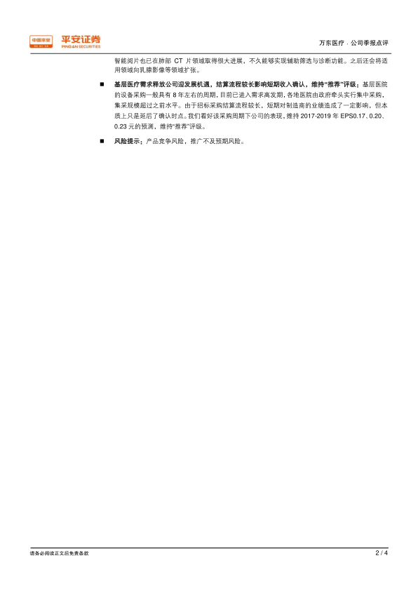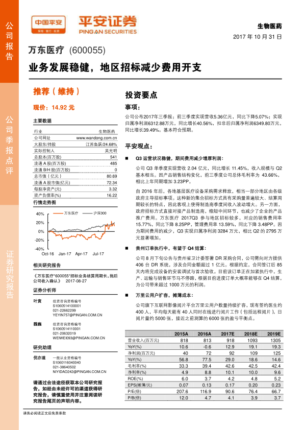 本报告分析了万东医疗2017年三季报,指出公司运营稳健,期间费用减少增厚利润。受益于基层医疗需求释放,公司积极参与地区招标,贵州订单有望在Q4结算。同时,万里云用户扩容,智能阅片取得进展。维持“推荐”评级,但需关注产品竞争和推广风险。