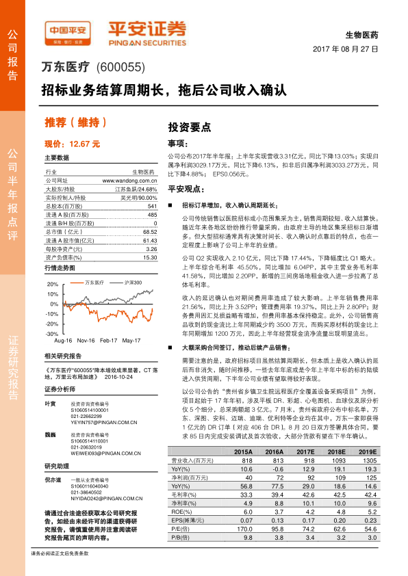 万东医疗2017年上半年业绩受政府招标业务结算周期延长影响,营收和净利润出现下滑,但毛利率有所提升。公司已签订的大额采购合同(如贵州省1亿元DR订单)预计将在下半年确认收入,有望推动业绩回升。同时,公司在远程影像读片服务领域的布局——万里云业务持续上量并接近盈亏平衡点,展现了新业务的增长潜力。作为国内影像领域的龙头企业,万东医疗通过拓展产品线和延伸至服务领域,巩固了市场地位。尽管调整了短期EPS预期,但鉴于其核心竞争力及战略转型进展,平安证券维持对万东医疗的“推荐”评级。