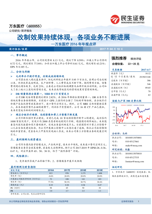 万东医疗2016年通过内部改制实现了显著的盈利能力提升,净利润大幅增长。公司在DR设备市场保持领先地位,并积极拓展MRI和CT等高潜力产品线。同时,公司顺应分级诊疗政策,大力发展远程影像和第三方影像服务,构建了新的增长引擎。鉴于其行业龙头地位、技术优势和战略布局,公司未来业绩增长可期,分析师给予“强烈推荐”评级,但需关注市场竞争和新业务拓展风险。