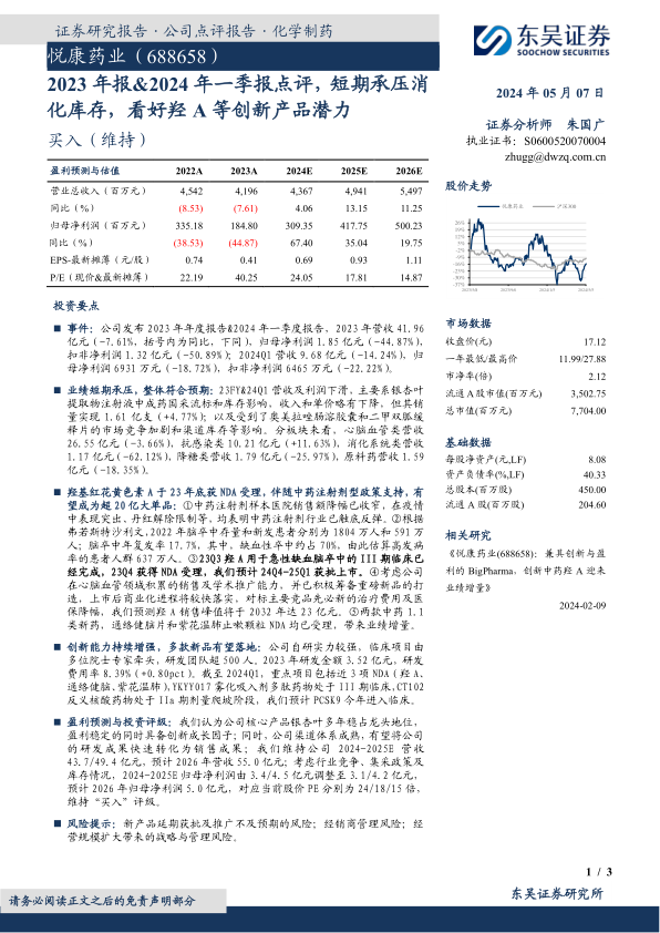 报告肯定了悦康药业的创新能力,认为其研发投入和临床项目将带来新的增长点。报告维持了对公司未来营收的预测,并根据行业竞争和集采政策调整了盈利预测,维持“买入”评级。