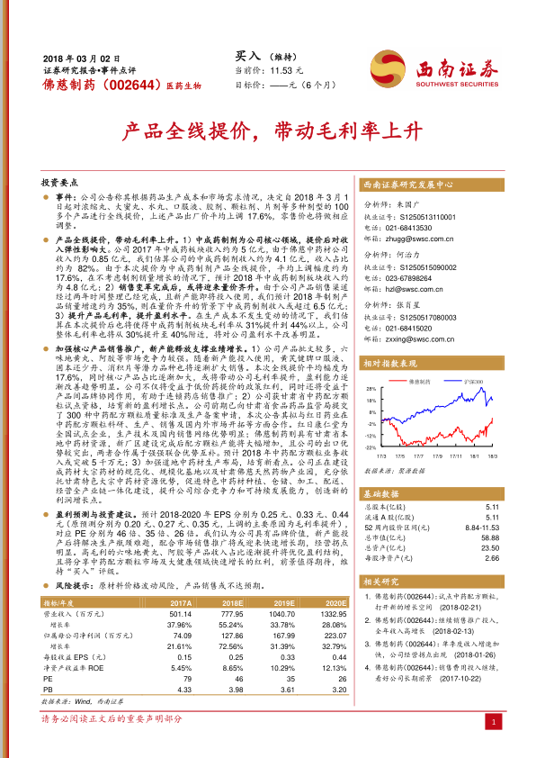 佛慈制药通过对核心中成药产品平均17.6%的提价,预计将显著提升公司毛利率至40%左右,从而大幅改善整体盈利能力。在完成销售渠道改革并释放新产能后,公司有望实现中成药制剂业务的量价齐升,预计2018年该板块收入将超过6.5亿元。此外,公司积极拓展中药配方颗粒业务,与红日药业的合作预计将带来超过5千万元的收入增量,并通过道地中药材全产业链布局,进一步增强长期竞争力。鉴于上述多重增长驱动因素和盈利结构的优化,分析师上调了公司未来三年的盈利预测,并维持“买入”评级,认为公司正处于明显的经营拐点,未来发展前景值得期待。