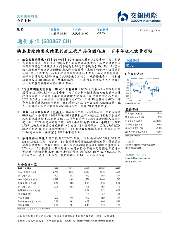 本报告分析了通化东宝在胰岛素集采落地后的市场策略和未来发展潜力。公司全系列胰岛素产品成功中选,为后续市场份额提升奠定基础。通过合理调整发货节奏和积极推进出海、研发,公司有望在未来实现收入和利润的稳健增长。