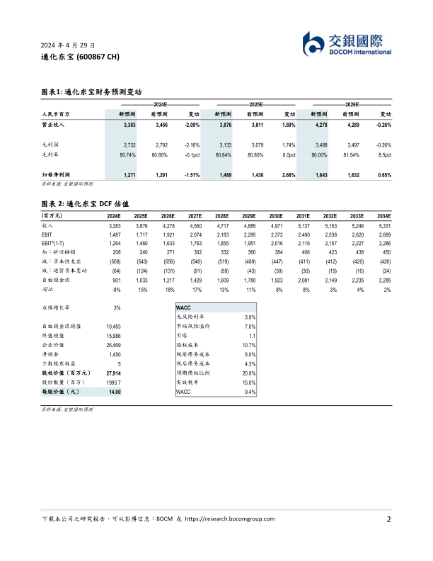 维持目标价不变:我们微调2024-26年收入预测-2/+2%/-0.3%至33.8亿/38.8亿/42.8亿元,考虑到:1)集采续标虽然短期内影响发货、导致渠道库存差额冲销,但我们预计公司三代产品的销量市场份额将快速提升至20%以上;2)根据本次集采结果,公司在标外市场中的份额也有望进一步提升。我们调整2024-26年净利润预测-2%/+3%/+1%至12.7亿/14.7亿/16.4亿元。基于DCF模型,我们维持公司14.0元目标价不变。
