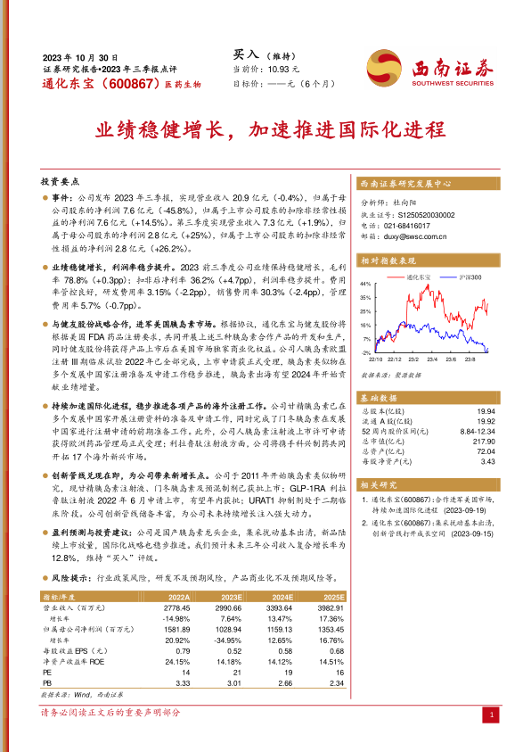 本报告分析了通化东宝(600867)2023年三季报,核心观点如下: