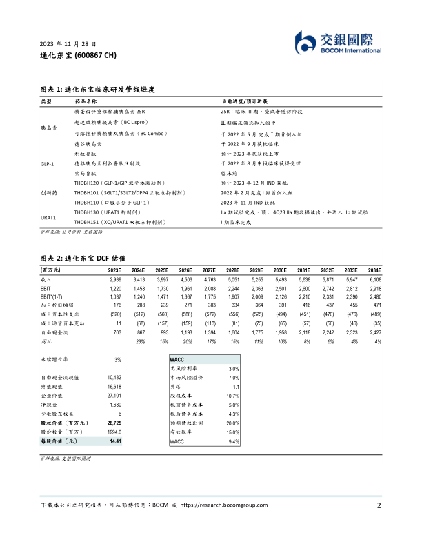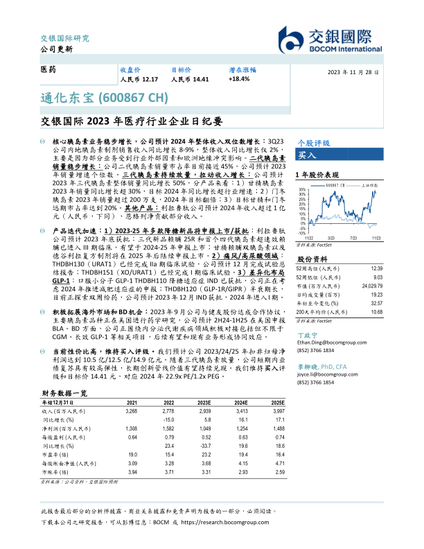 本报告由交银国际发布,对通化东宝(600867 CH)进行了公司更新,维持“买入”评级,目标价为人民币14.41元,潜在涨幅为18.4%。